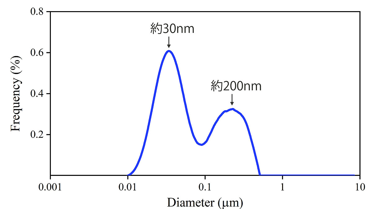 従来の動的光散乱式やレーザー回折式の粒度分布計では、広い範囲の粒子径を正確に測定することが難しく、遠心沈降式の粒度分布計であれば測定できることがわかりました。