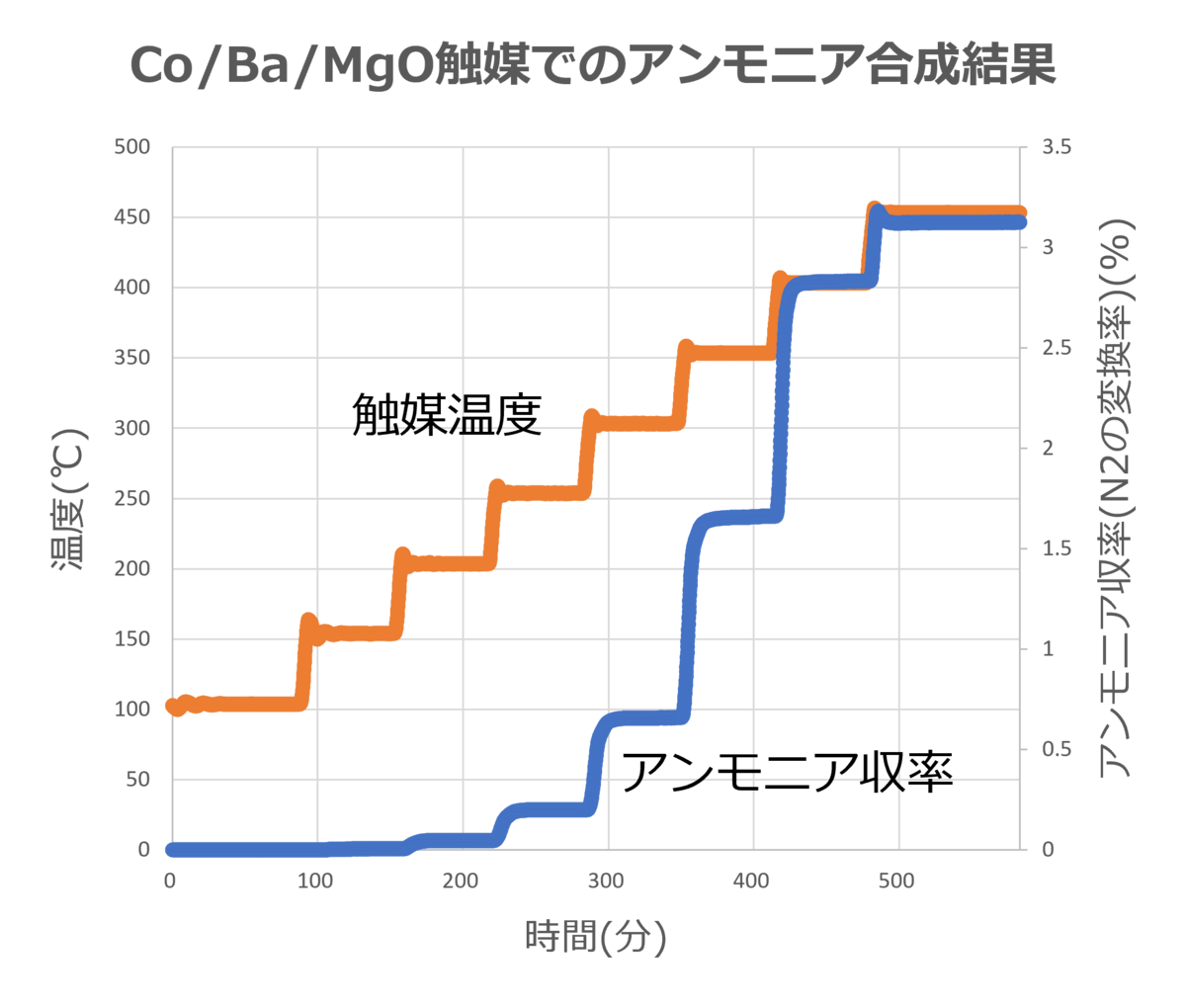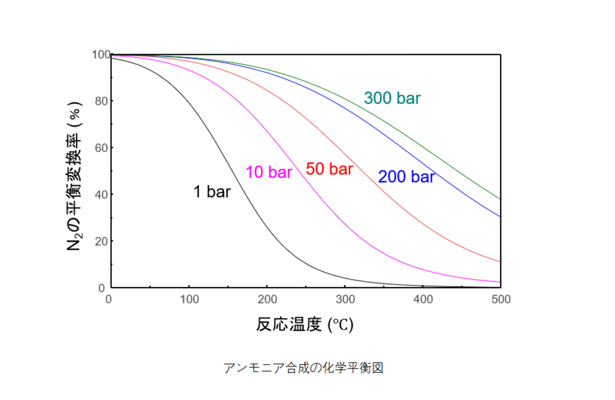 アンモニア合成での窒素の変換率は、平衡状態での温度とのグラフから温度が上がると低下します。したがって化学平衡上は低い温度で合成することが求められますが、ハーバー・ボッシュ法の鉄触媒は低温での性能が低いので500℃、 200気圧において30%程度の性能しかでません。化学平衡上は300℃~350℃、50~70気圧でもハーバー・ ボッシュ法を超える窒素の変換率が得られるはずなので、より低温でアンモニアが合成できる触媒を作り、それを実現するための研究に日々取り組んでいます。