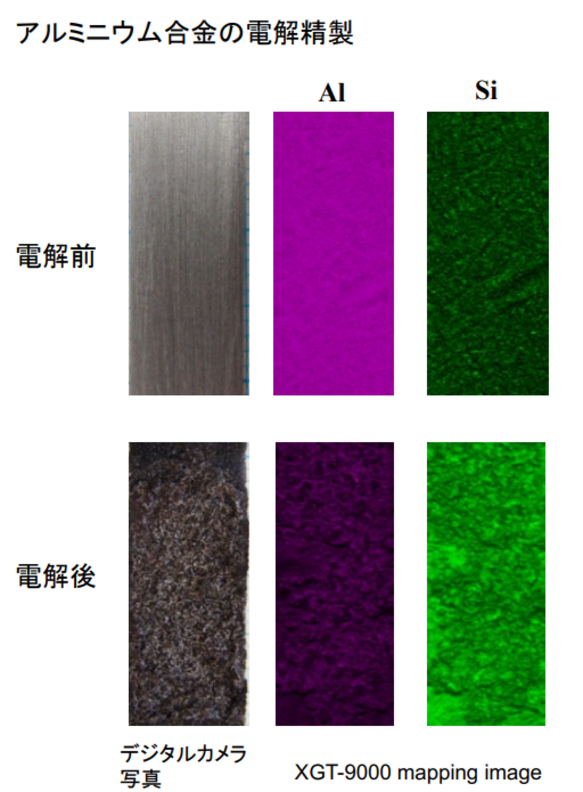 HORIBAの微小部X線分析装置 XGT-9000との出会いは、2019年に開催された表面技術協会の講演大会でHORIBAの担当者に電析後の電極の元素分布を広い範囲で分析できないかと相談したのがきっかけでした。私の研究室では室温や100℃以上の温度域でアルミニウム合金の電解精製の実験を行なっています。電解精製反応は、アノードのアルミニウム合金からアルミニウムが優先的にイオンになって電解液に溶解し、カソードでは、そのアルミニウムイオンが還元されて金属のアルミニウムとして電析します。つまりアノード表面には合金添加元素が多く残される事になります。その合金添加元素の分布をXGTのマッピング機能を使って分析しています。カソードで電析する純度の高いアルミニウム中に不純物としてどのような元素が含まれるかも同じように調べています。元素分布を調べるには走査型電子顕微鏡(SEM)に付属するEDS※3測定でも調べることができますが、試料の観察範囲が小さいことがネックでした。XGTは試料全体をマッピングもできるので2020年に導入しました。広い範囲をマッピングで観察できるのがとても便利です。