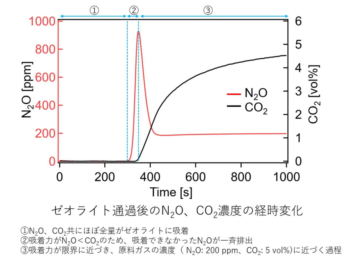 さらに、CO₂にとどまらず、メタン(CH4)、亜酸化窒素(N₂O)といった温室効果ガスの削減にも応用すべく、ゼオライトを利用した吸着・触媒技術により、これらのガスを濃縮し、その場で分解する仕組みの構築をめざしています。特に高い温室効果を持つN₂Oの研究では、濃縮したガスをその場で分解する技術を開発し、温室効果ガス削減に向けた実用化への大きな一歩を踏み出しています。