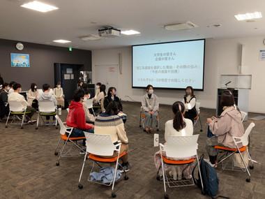 京都の企業で活躍する女性技術者の一人として、当社の科学開発部で製品開発を担う柳井 優花が登壇し、他企業の女性技術者や京都の理工系大学の女子学生の皆様とともに、自身の学生時代から現在の仕事におけるさまざまな経験を中高生に向けて伝えました。