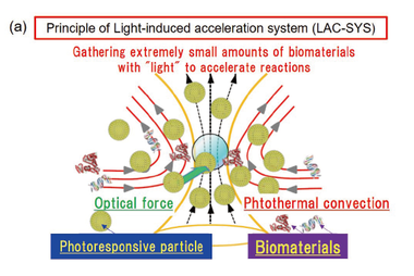 医療,創薬,公衆衛生における生体試料(タンパク質,核酸,微生物など)の測定では,従来法は煩雑かつ長時間の操作が必要なことが多く,感度も改善の余地があった。筆者らは,液中の光応答性材料(基板,粒子)への光照射時に生じる「光圧」と「対流」を相乗的に利用し,流路内の狭小空間で測定対象とプローブ粒子を濃縮して反応を加速することで迅速・高感度な計測を実現するマイクロフロー型の光誘導加速システム(LAC-SYS)を開発した。これにより従来法と比べて数十~数百倍の高感度を達成し,極微量(fgオーダー)のタンパク質を数分間で定量評価することに成功した。本技術は医薬品開発や個別化医療,食品検査など幅広いバイオ計測を革新するものである。