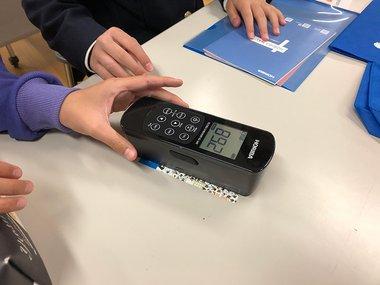 テーマは“「はかる」と「わかる」”。当社社員が講師となり、「はかる」技術が身の回りでどのように活用されているかについてご紹介しながら、生徒さんたちに当社の製品である放射温度計や光沢計を使って、測定を体験していただきました。