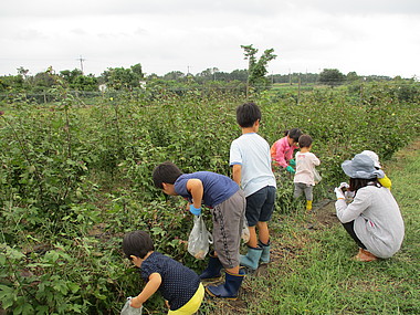 2012年、滋賀県高島市に自社農場「HORIBA Blueberry Farm “Joy and Fun”」を開園。23,000m2の農地ではブルーベリーや季節野菜、オーガニックコットンなどを栽培しており、ここで収穫したブルーベリーは、ジャムやジュースなどに加工して当社独自のお土産物として活用するほか、野菜は社員食堂や研修所で利用しています。また、季節ごとに従業員と家族が参加する種まきや収穫などのイベントを開催し、イベントを通じた心身のリフレッシュとコミュニケーションの創出や、土に触れる機会として若手社員や子どもたちの五感教育につなげています。
