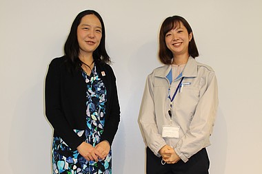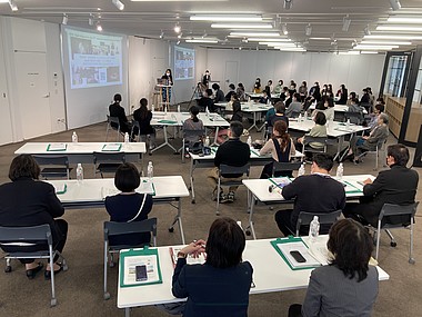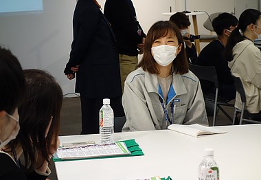グループワーク形式で行う第2部では、当社の医用事業本部で製品開発・設計を担う大橋彰華(あきか)が登壇し、中島氏や同じ京都府内で働く企業の女性技術者や研究者、理系分野を専攻する女子大学生らとともに意見交換に参加しました。