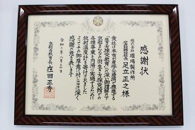 京都市教育委員会が運営する教育施設「京都まなびの街 生き方探究館」に、放射温度計3台を寄贈した御礼として、9月15日に京都市教育委員会の方々が来社され、HORIBAに感謝状が贈呈されました。