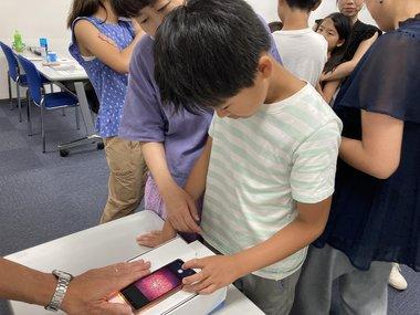 堀場製作所の放射温度計を使い、自分の手のひらや、自分が持ってきた水筒のお茶、教室内のプロジェクタなど身近なものの温度をどんどんはかっていく子どもたち。天井やエアコンの吹き出し口の温度を遠くからはかれることに、とても驚いた様子でした。