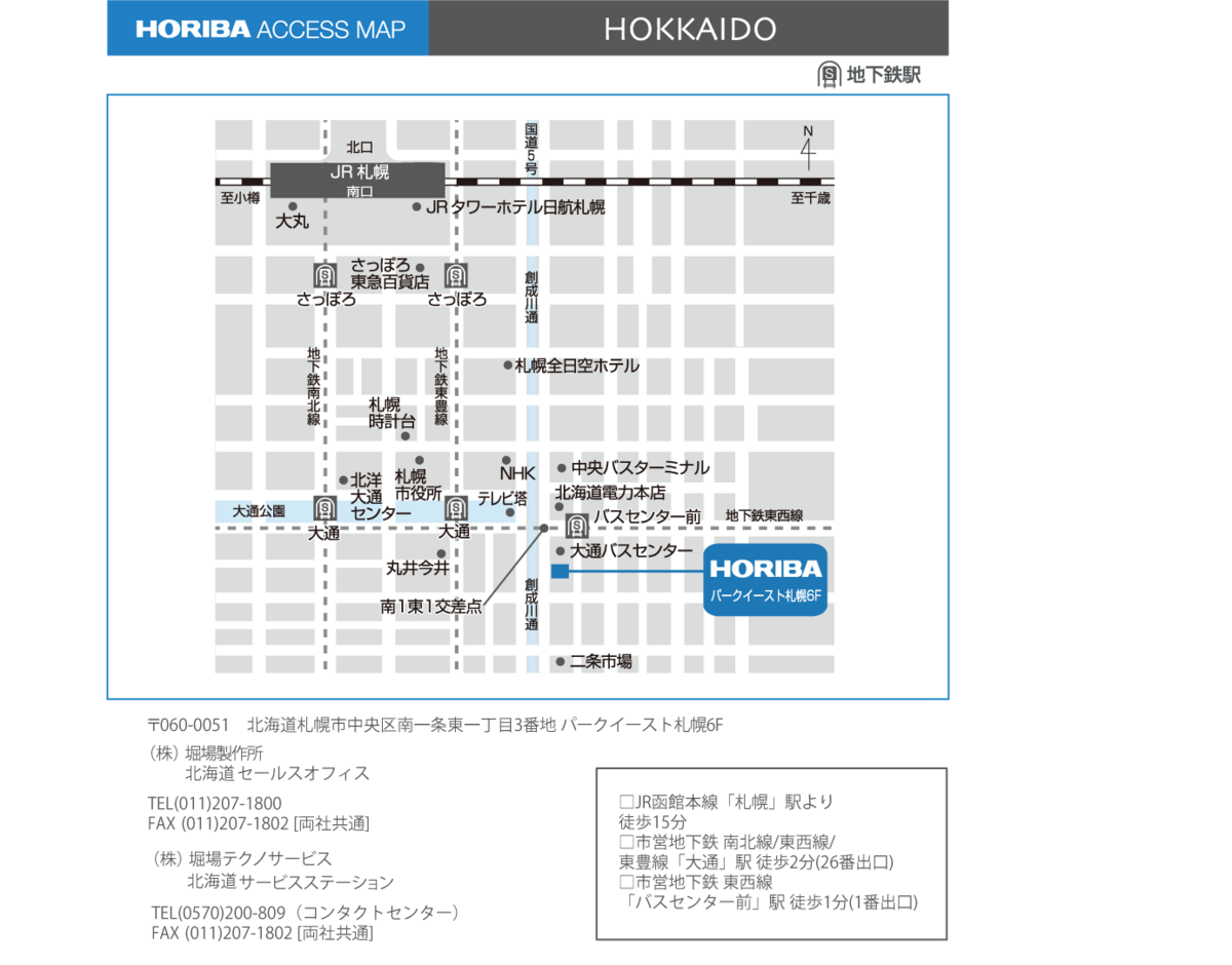 株式会社堀場テクノサービス 北海道サービスステーション 060-0051 札幌市中央区南一条東一丁目3番地(パークイースト札幌6F) 0570 200 809(コンタクトセンター) 050-3730-0694(サービスステーション共通FAX)ウェブサイト (ローカル言語で表示されることがあります)