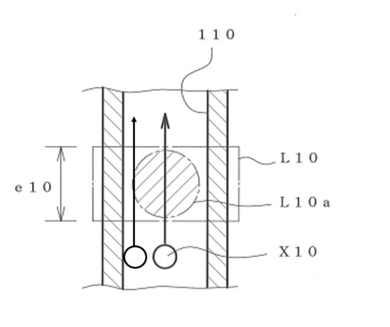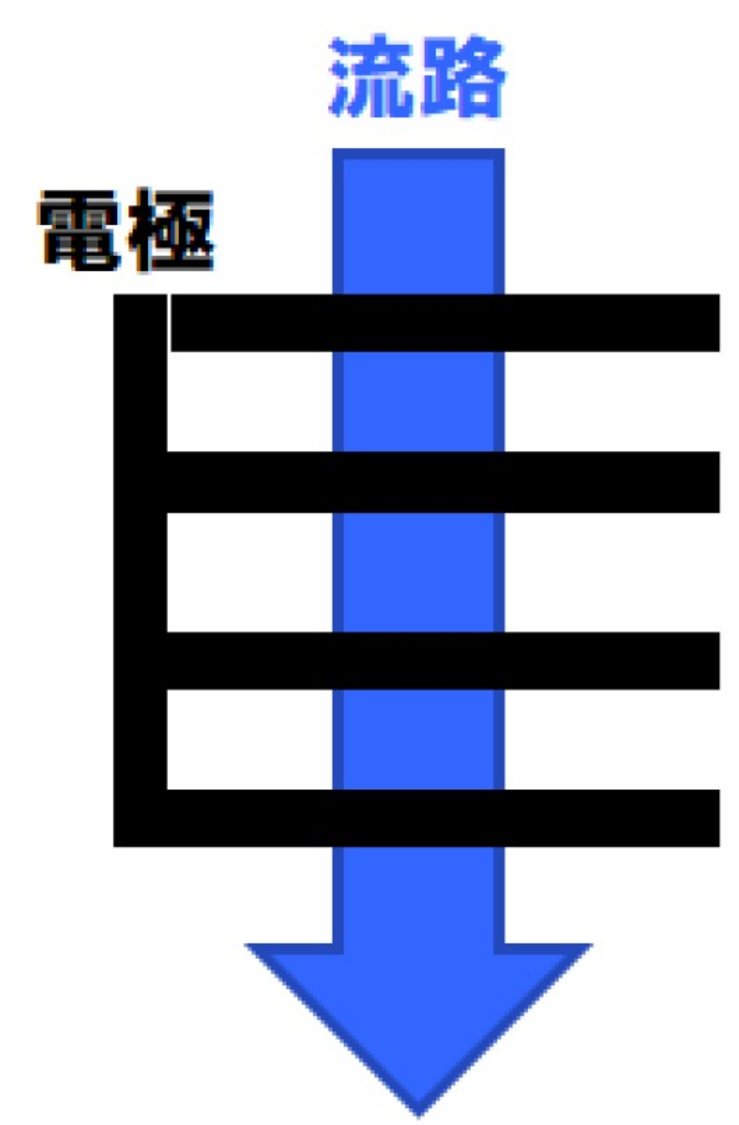 そこで本発明では、複数の電極が互いに平行に配置されたくし部分を有するLED電極を採用しました。LED電極のくし部分と、分析すべき粒子を含んだ試料液を流すための流路(フローセル流路と呼ぶ)の方向とが直角に交わる(図3、4)ことで、流路内の血球がどの部分を通っても影部分が同じ大きさになり、測定誤差を低減できるようになりました。
