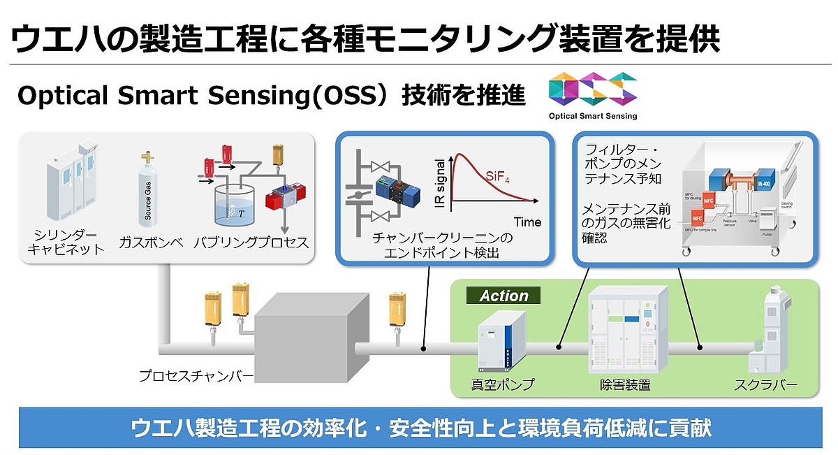 チャンバーのクリーニング状態や真空ポンプ内の副生成物の濃度を常時モニタリングすることで、チャンバーをメンテナンスする最適なタイミングが分かったり、精密パーツの閉塞やポンプの突発的な停止を未然に防いだりすることが可能となり、ウエハ製造工程の効率化・安全性の向上と環境負荷低減に貢献します。
