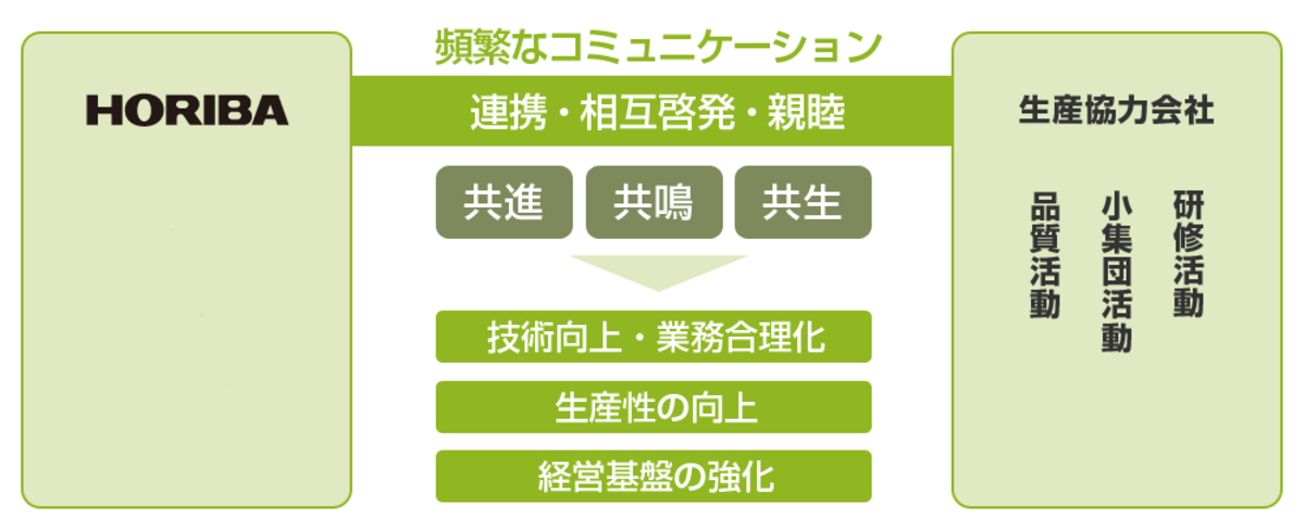 高品質の製品を、最適納期でお客様に納入するために、生産協力会社と長期的な信頼関係を築いています。現在、グローバルに展開する海外グループ会社のネットワークを通じて海外調達も増加してきています。一方、国内では、より長期的なwin-winの関係を維持するために、生産協力会社と、経営課題の共有や次世代経営者を育成する場の提供などを行っています。国内グループ会社の取引先と、共進・共鳴・共生をモットーとして、相互に啓発し合い、生産協力会社と共同で下記の取組みを行っています。