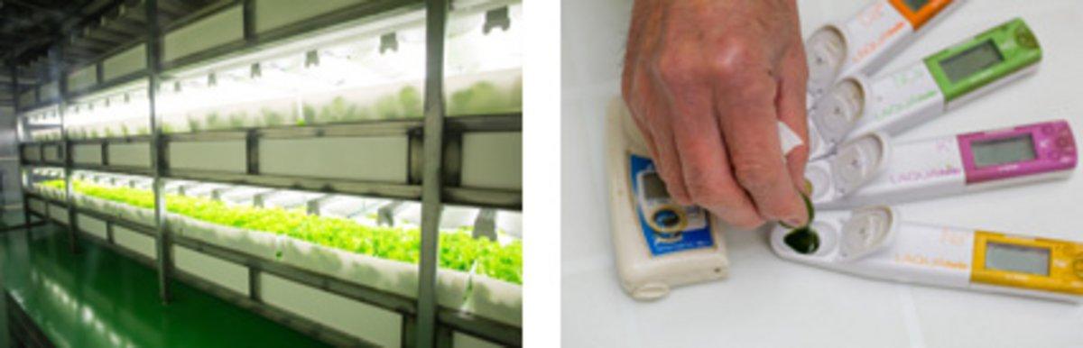 宮下さん:LAQUAtwinシリーズの、pH(ピーエイチ)、ナトリウムイオン、硝酸イオン、カリウムイオン、カルシウムイオンの計5種類を使用しています。養液を使う工程は4工程あり、毎日計測が必要。野菜が吸収する量は工程ごとに違うため、毎日養液の濃度を同じにすることがとても重要なんですよ。また、収穫したレタスそのものの栄養素の値も、毎日チェックしています。文科省の食品データーベースと比べ、当社で作るレタスには、骨や歯を形成するミネラルであるマグネシウムが3倍、カルシウムが1.3倍含まれています。今は、味覚を正常に維持したり皮膚や粘膜の健康維持を助ける亜鉛の含有量を多くするための工夫をしています。