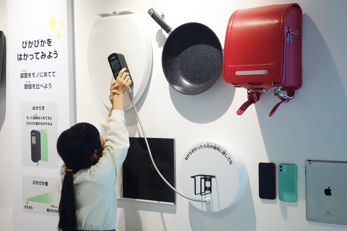 こちらのコーナーには、フライパン、お皿、スマートフォン、タイヤ、学校のつくえ、ランドセルなど、みんなの身近にある20種類以上のものがあります。