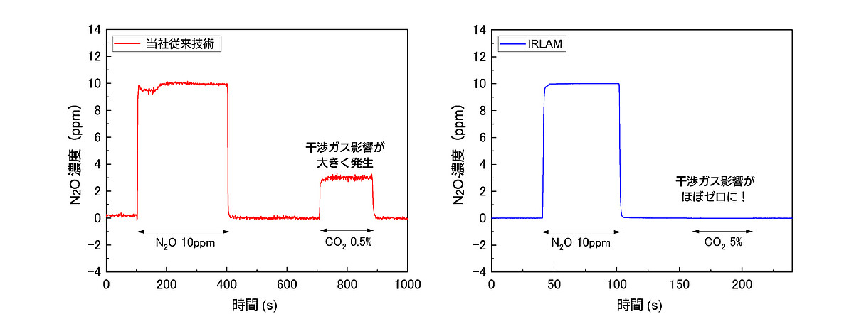② 一酸化二窒素(N2O)分析計における干渉影響の試験結果の例:当社従来の赤外ガス分析技術(NDIR)では不可能であった干渉ガス影響をほぼゼロにすることを実現