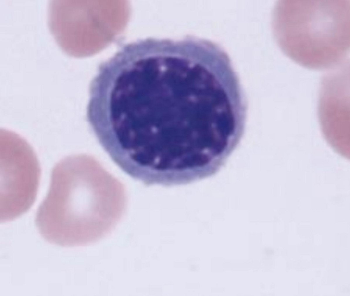 核は丸く、やや灰色がかった細胞質、直径10-15μmの中型細胞。 ヘモグロビン合成に伴い、細胞質はRNAが減少するにつれて青色から灰色がかった色の変化する。クロマチンは粗荒である。