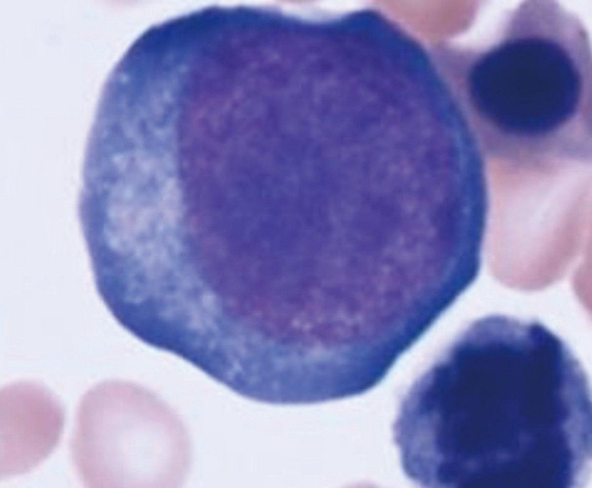 クロマチン構造は顆粒状、大きさ20μmの円形細胞。細胞質は全体に好塩基性が強い。N/Cは高い。