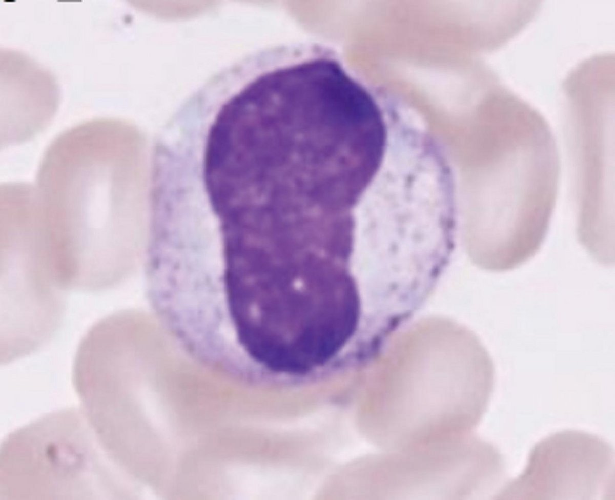 凹面の核(核幅>1/3 )で核が濃縮している大型の細胞。薄い青色からピンク色の細胞質に、多くの好中性顆粒がみられる。ゴルジ野はみられない。 骨髄産生能亢進時に血中にみられる。 血液疾患:慢性の骨髄性白血病+++、骨髄線維症(赤血球系細胞増加症) 反応的増加:重症感染、G-CSF治療による顆粒球の再生