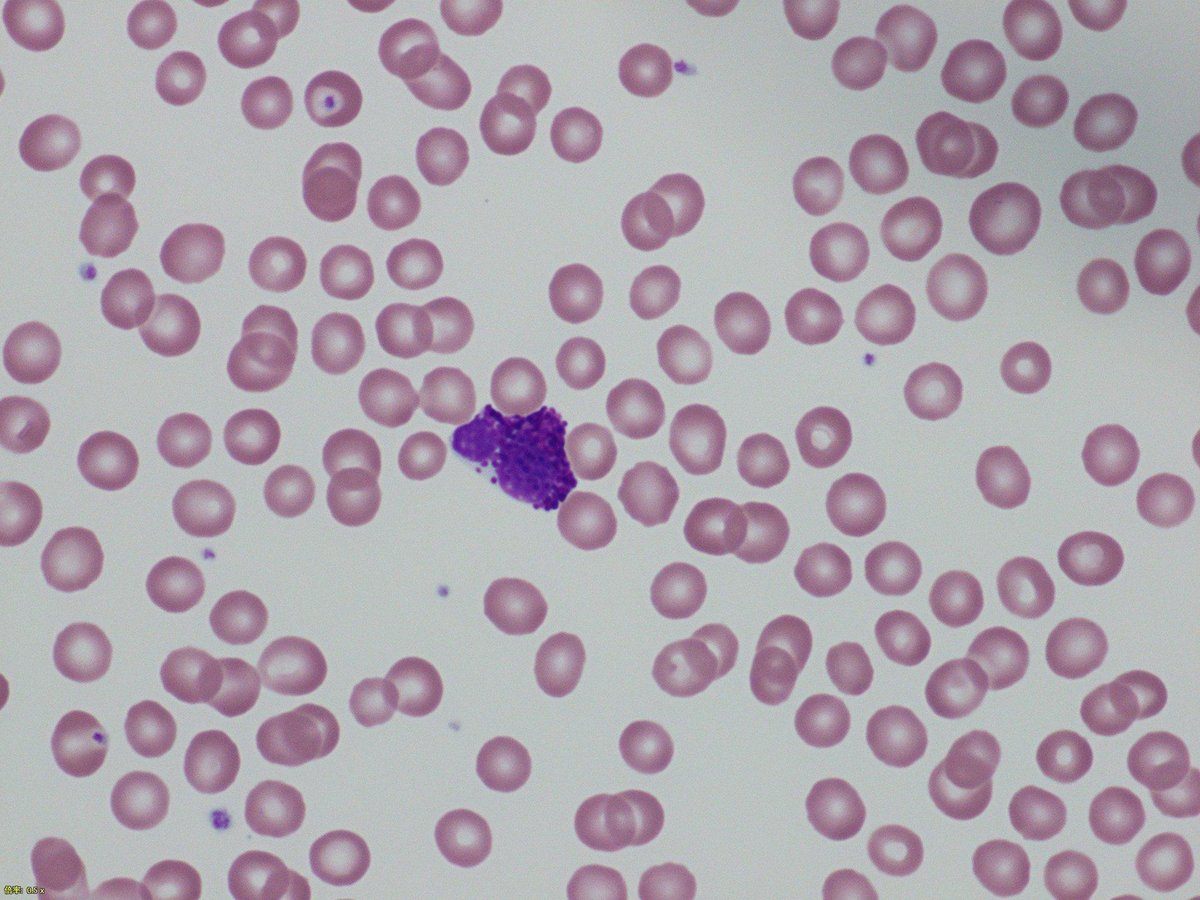 核小体が無く、核は分葉し、核クロマチンは濃縮し、細胞質は大小不揃いな塩基性の顆粒に覆われている。大きさは平均的で丸い細胞。 慢性骨髄性白血病では好塩基球の増加がみられる。