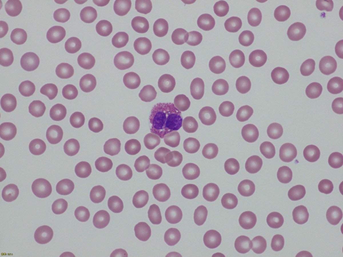 財布のように折れ曲がり、クロマチンが濃縮した核の中型の円形細胞。ビーズがびっしりと詰まったような非常に大きい好酸性顆粒が細胞質にみられる。