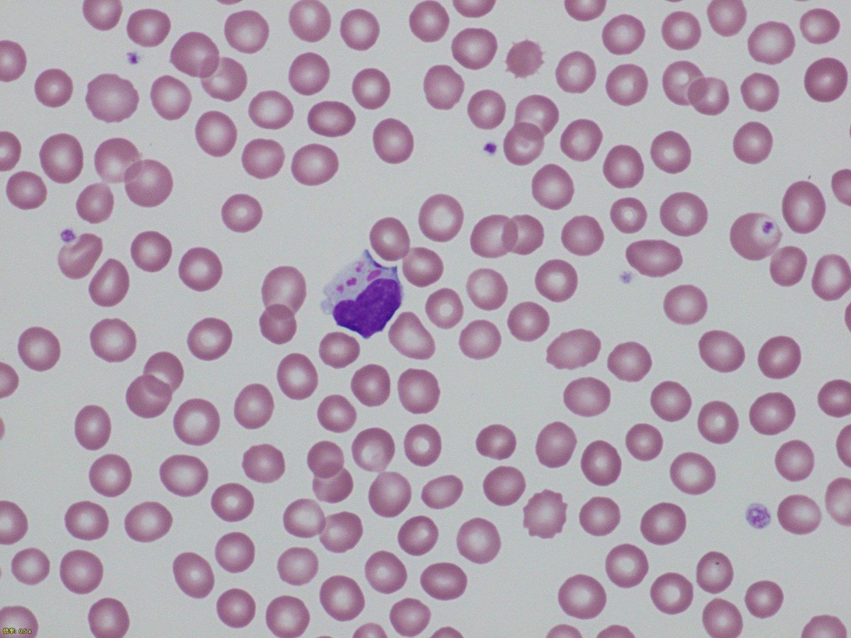 円形あるいは類円形中型の細胞、核クロマチンは濃染し、核小体はみられず、細胞質はガラス様の薄い色から青い色まで幅広くみられ、アズール顆粒がみられる。 T/NK LGL(大顆粒リンパ球)白血病は、LGLが500/μL以上で、分子生物学的手法あるいはサイトメトリーで一つの系統の細胞の増加が確認される。 反応性リンパ球増加症(臨床症状を示唆する濃青色の細胞で色々な形態を示す細胞が増加)。