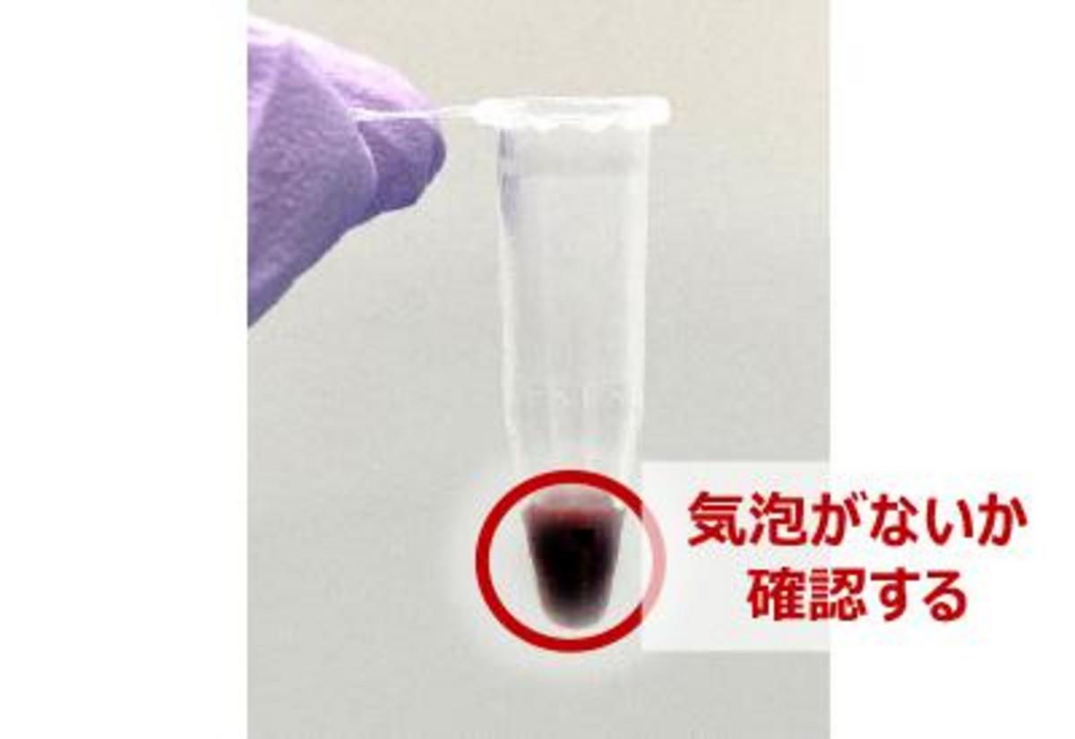 気泡がある場合は、微量容器の蓋を閉じてゆっくりと微量容器を振る、指先で微量容器の気泡部をはじくなどして、気泡を取り除いてください。