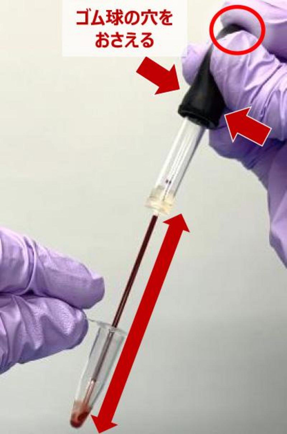 ゴム球の穴をおさえた状態で、ゴム球をつまんだり、離したりして、微量容器内の検体をしっかり混和して下さい。