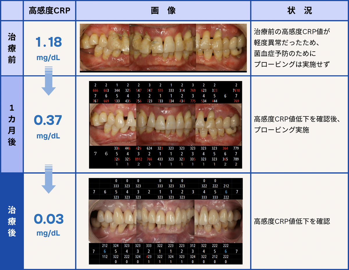 ※高感度CRP値は全身の炎症状態を反映しているため、口腔内の炎症状態とCRP値に相関関係があるとは限りません。