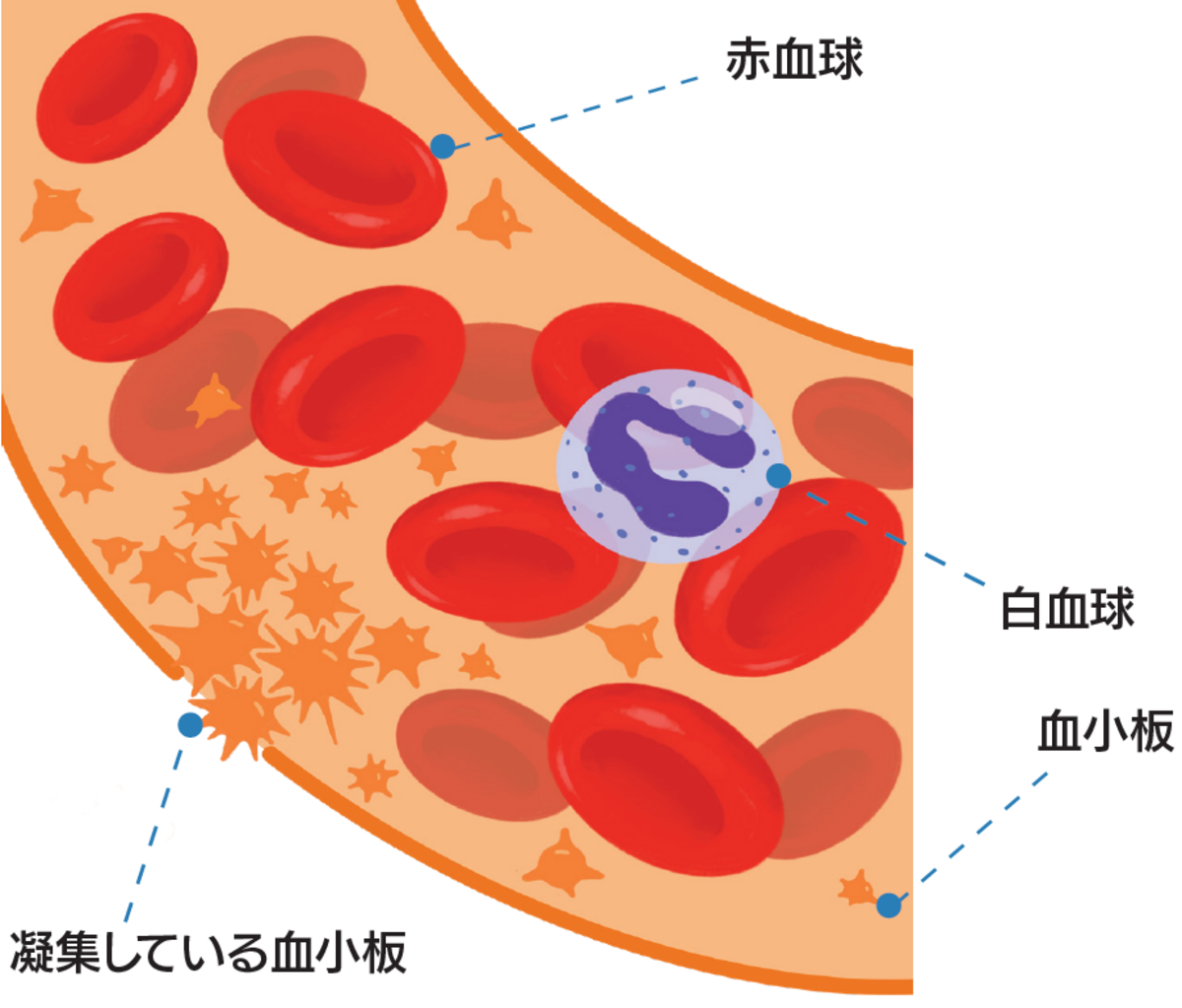 血小板とは血液中に含まれる細胞の1種で、血液1mm³(μL)中に15.8~34.8万個あり、不定形の小片(2~3μm)として血管中を循環しています。血管の内壁が何らかの原因で傷つくと、血液が血管の外へ出ないようにする、止血の中心的役割を果たしています。
