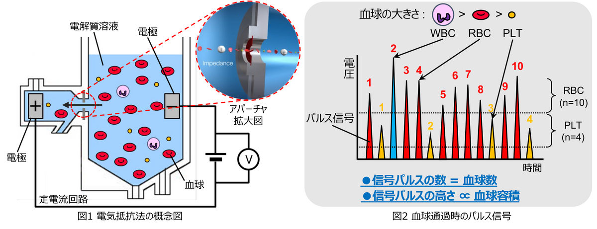 このパルス信号の数をカウントすることで白血球や赤血球、血小板などの血球数を計測します。