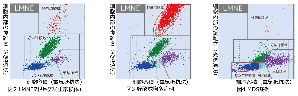 HORIBAでは、この白血球分類の二次元グラフを4種類の細胞の頭文字をとって「LMNEマトリックス」と呼んでいます。