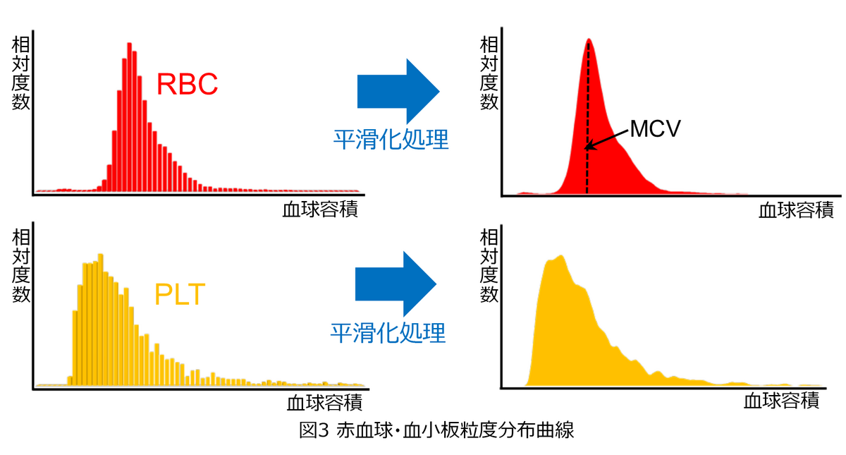 自動血球計数装置では電気抵抗法によって得られたパルス信号の情報から、横軸に血球容積、縦軸に相対度数の