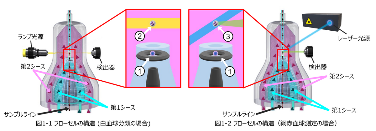 *1:シースフロー構造…サンプルライン(血球浮遊液)の流れを絞り、鞘(Sheath:シース)状に周囲を別の流れで包むことで、中心部のサンプルラインの流れを層流に保ち、サンプルが測定部に個々に通過するようにしたもの。