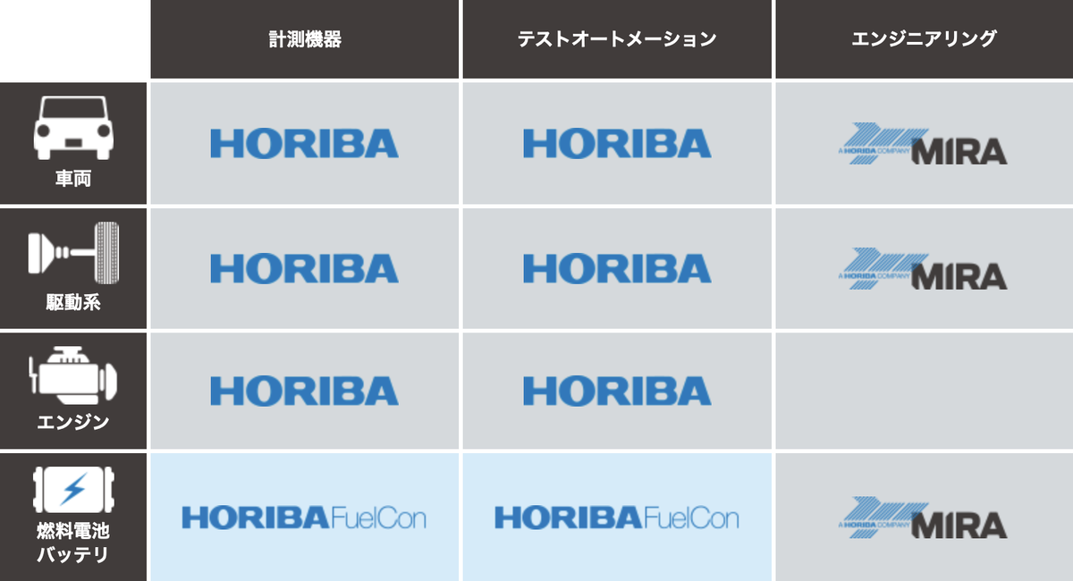 HORIBAが持つエンジンや駆動系の計測技術とHORIBA FuelConが持つ燃料電池・バッテリの計測技術を組み合わせることにより、