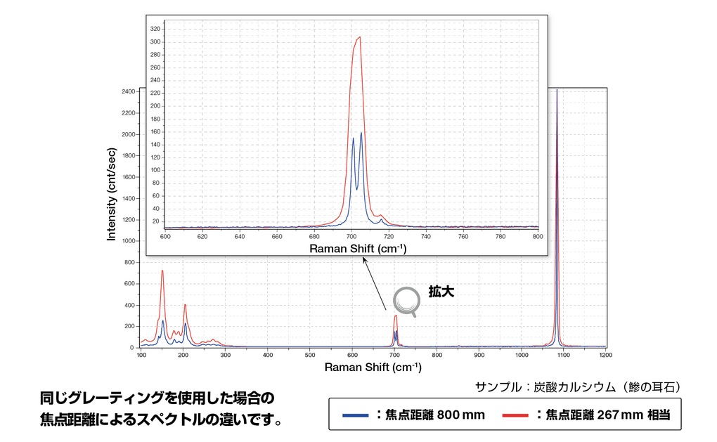 | 波数分解能(FWHM) | @ 244 nm 励起波長 1.5 cm-1(グレーティング 3600 gr/mm使用時) @ 532 nm 励起波長 0.6 cm-1 (グレーティング 1800 gr/mm使用時)、0.3 cm-1(グレーティング 3000 gr/mm使用時) @ 633 nm 励起波長 0.4 cm-1(グレーティング 1800 gr/mm使用時)、0.2 cm-1 (グレーティング 2400 gr/mm使用時) @ 785 nm 励起波長 0.2 cm-1(グレーティング 1800 gr/mm使用時) | |