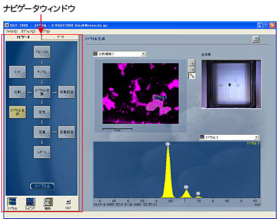 分析手順を知らなくてもナビゲータウィンドウによって分析手順がわかり、そのフロー(ボタン)を選択するだけで目的の操作ができます。各部分での操作は充実したアドバイスにより簡単にわかり、精度の良い自動定性と定性確認機能で、正確な分析が行なえます。