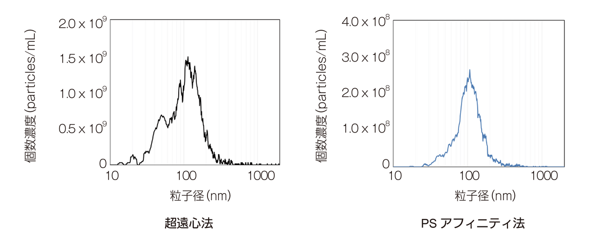 エクソソームはさまざまな細胞から分泌される直径100 nm程度の細胞外小胞で、バイオマーカーとしての応用が期待されています。 エクソソームの分離・精製には、超遠心や限外ろ過などの手法が利用されますが、膜フラグメントやタンパク質凝集物などの夾雑物も含まれるため、エクソソームだけを見ることが難しいと考えられています。 超遠心法と PS※2アフィニティ法による精製を比較したところ、超遠心法精製(左図)では夾雑物も含んでいることが推測されますが、PS アフィニティ法による精製(右図)では、100 nm 付近にシャープな 分布が確認でき、高純度に精製されたエクソソームの粒子径と個数濃度の情報が得られ、精製状態の違いを確認できました。 ViewSizer3000は青、緑、赤色の3波長レーザを用いたワイドレンジ測定のため、このような粒子径分布が広い試料の測定に有効です。