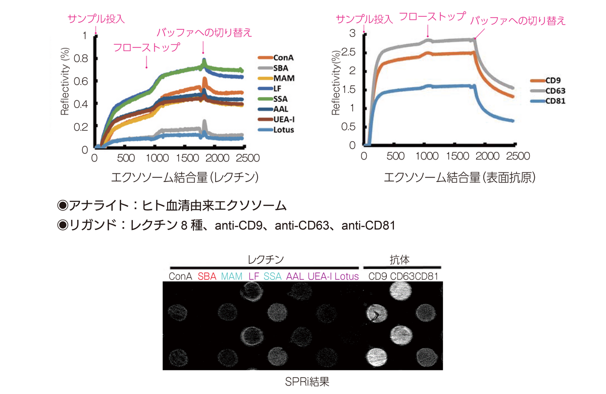 バイオチップ表面に糖鎖結合タンパク質であるレクチン8 種とエクソソームマーカーであるCD9・CD63・CD81 のモノクローナル抗体を固定化し、ヒト血清由来のエクソソームを流すことで、エクソソームであることの確認と表面糖鎖のプロファイリングを行いました。 反応後のバイオチップ表面とインジェクション前の差分画像をリアルタイムに表示することで、リガンドとアナライトとの結合の定性的な結果が迅速に得られました。 また、反応速度論的パラメータを同時に求めることができ、相互作用による結合変化をリアルタイム、かつマルチチャンネルで計測できました。