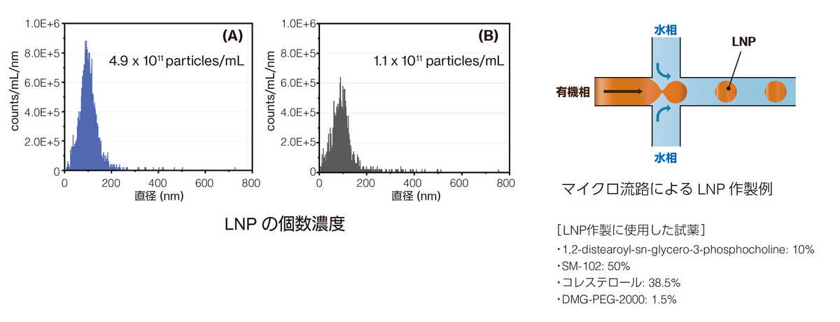 マイクロ流路を用いて作製したLNPの粒子径分布と粒子数を測定しました。有機相と水相の流量比が変わると、LNP粒子(A、B)の粒子径と製造量に違いが生じることを評価できました。
