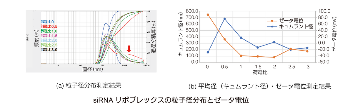 粒子径分布測定により、荷電比0.5の条件下では、ラメラ構造に由来すると考えられる1 μmを超える粒子が検出されました (a)。さらに、ゼータ電位測定により、荷電比0.5の条件下では、ゼータ電位は0 mV付近となり、静電的相互作用によって凝集が起こったと考えられます(b)。