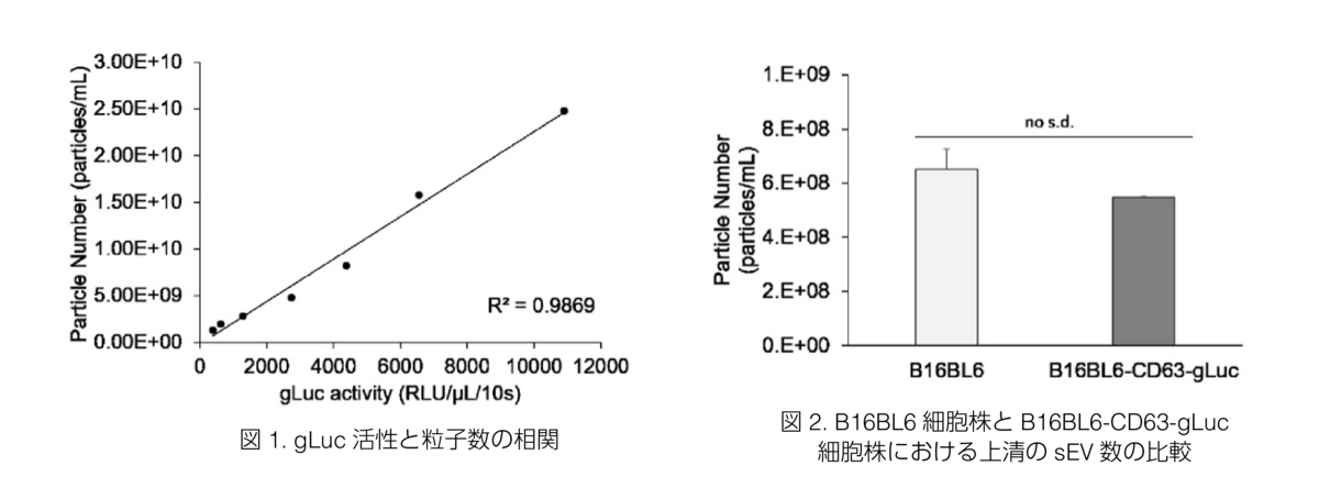 マウスメラノーマ細胞B16BL6にGaussialuciferase(gLuc)レポータータンパク質*とsEVマーカー(CD63)発現遺伝子をトランスフェクションし、マーカータンパク質であるCD63に結合したgLucタンパク質を用いてsEV膜内を標識しました。B16BL6-CD63-gLuc細胞培養液を遠心し、ナノ粒子径分布・濃度測定装置ViewSizer3000を用いて、上清から分離したsEVの粒子数濃度を計測し、ルシフェラーゼ(gLuc)活性の定量を行いました。その結果、gLuc活性とsEV粒子数の間には、正の相関があり(図1) gLuc活性データは、sEV定量のための推定値として使用できることが実証されました。さらに、B16BL6細胞株とトランスフェクションしたB16BL6-CD63-gLuc細胞株間において、上清に分泌されたsEV数に有意差は認められないことがViewSizer3000を用いた粒子数計測から確認されました(図2)。