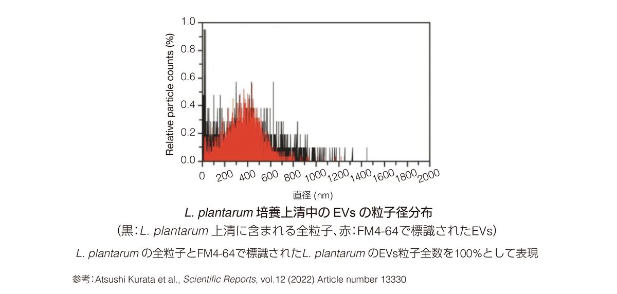 蛍光フィルタ(オプション)を用いた測定により、蛍光標識したEVsのみを定量することができます。L. plantarum(乳酸菌)培養上清の粒子径分布測定の結果、50~800 nmの粒子が含まれ、約400 nmのEVsが多数存在することがわかりました。