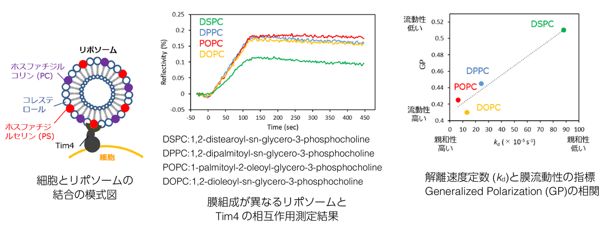 受容体(Tim4)と膜組成が異なる4種類のリポソームの解離速度定数(kd)と蛍光物質を用いて測定した膜流動性の評価により、膜流動性が高いほどリポソームと受容体の相互作用が強くなることが示唆されました。
