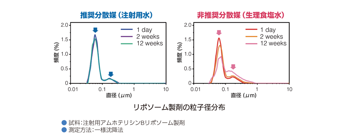 異なる分散媒を用いて分散させたリポソーム製剤の粒子径分布の経時変化を、サイズごとに分級しながら測定できる遠心沈降法を用いて測定しました。非推奨分散媒で分散した製剤において、180 nm 前後の頻度が高くなり、経時的に粒子径分布が変化する様子を捉えることができました。