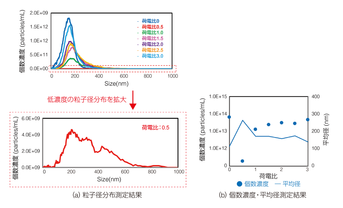 粒子径分布測定の結果から、粒子の大半が200 nm程度のものであることが確認されました(a)。また、個数濃度・平均径測定結果から、荷電比0.5付近の場合に平均粒子径が大きくなり、同時に個数濃度が減少していることが確認されました(b)。このことから、粒子同士が凝集することで平均粒子径が増加し、それに伴って個数濃度が減少したことが裏付けられました。