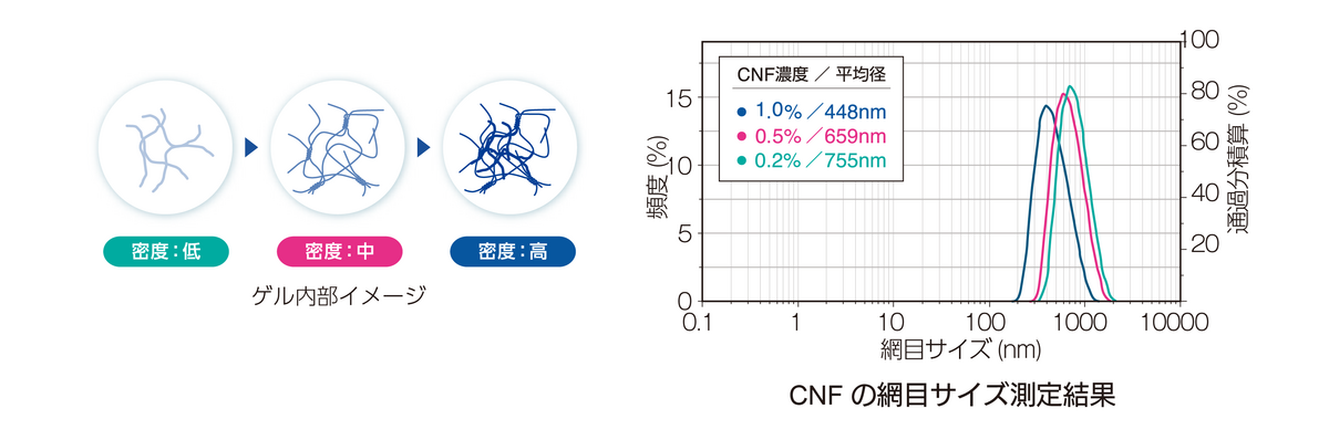 セルロースナノファイバー(CNF)ハイドロゲルは、濃度が上がると密度が高くなり、網目サイズが細かくなります。濃度の違うCNFハイドロゲルを測定し、CNFの濃度とゲルの網目サイズに相関性があることを確認しました。