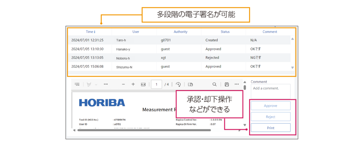 取得した測定データを元に作成した分析レポートの承認、却下(修正の依頼)などの操作が行えます。レポートには多段階の電子署名が可能です。