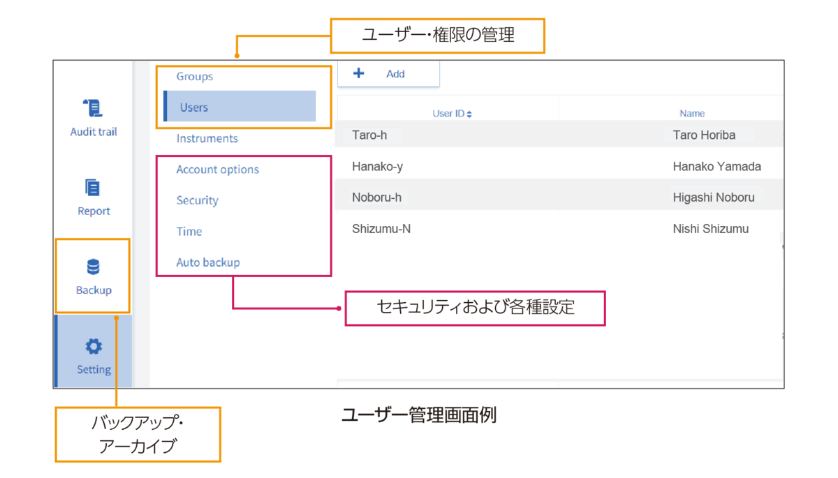 操作ログ、HORIBA PLATINALINKソフトウェアの設定、ユーザー情報、機器の測定データ、機器設定などのバックアップ、アーカイブが行えます。