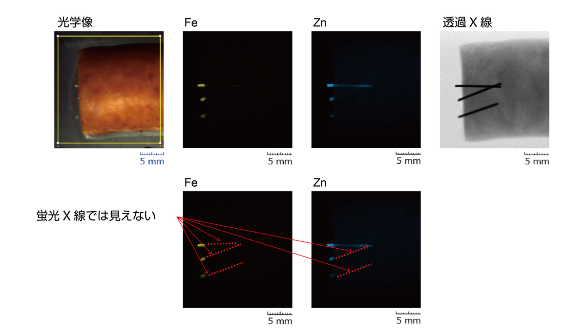 意図的に異物を埋めたソーセージを測定した事例を紹介します。 試料によって蛍光X線が吸収されるため、蛍光X線だけでは見つけられない食品に埋没している異物も透過X線により可視化できます。