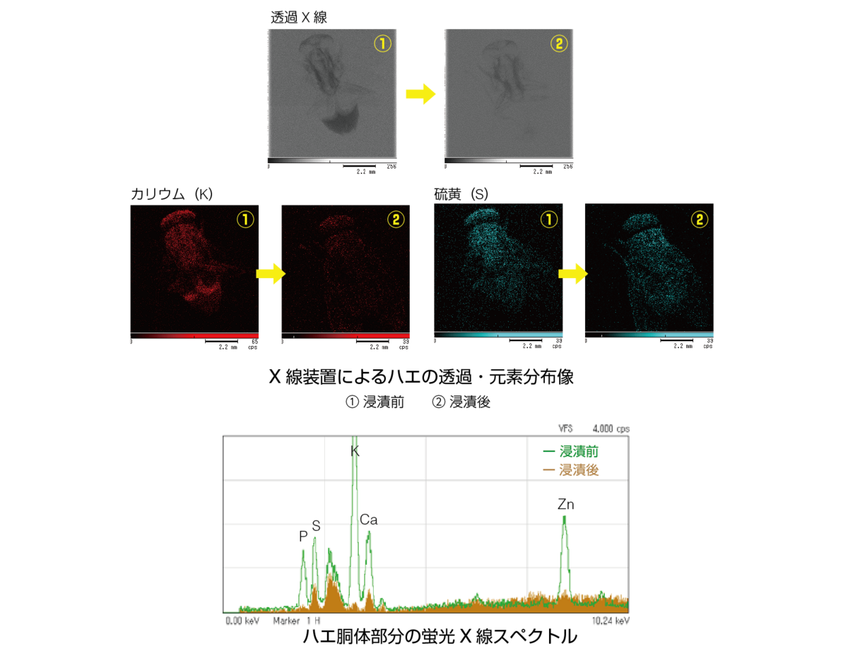 製品に混入したハエなどの昆虫には、カリウム(K)や硫黄(S)など、多くの元素が含まれています。これらの元素の測定結果から昆虫が製品に混入した時期を推定できる可能性があります。ビールに3週間浸漬したハエを分析し、カリウム、硫黄の溶出状況を比較し、浸漬後にハエ体内の元素量が減少していることを確認しました。