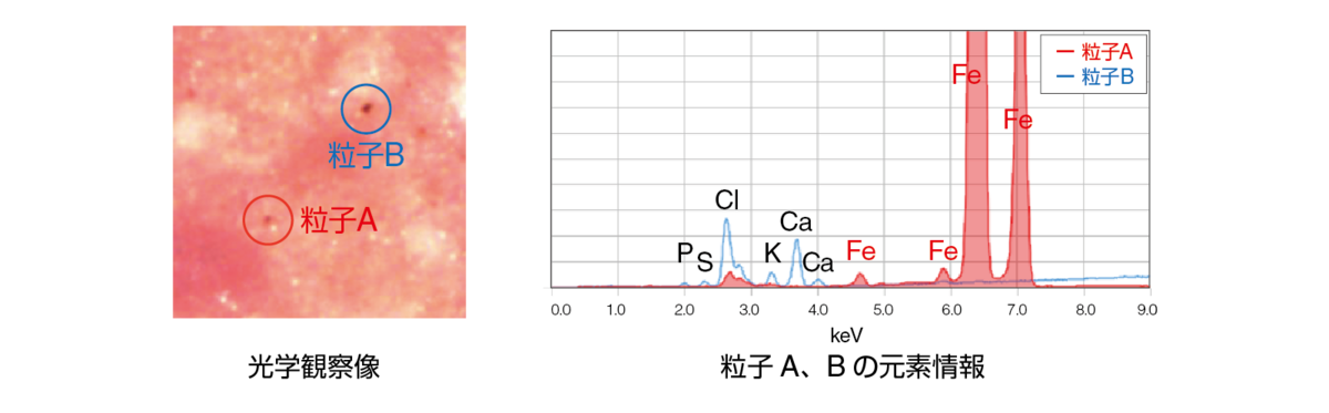 元素分析の結果、粒子Aは鉄粉(Fe)であり、粒子Bは金属異物ではないことがわかりました。